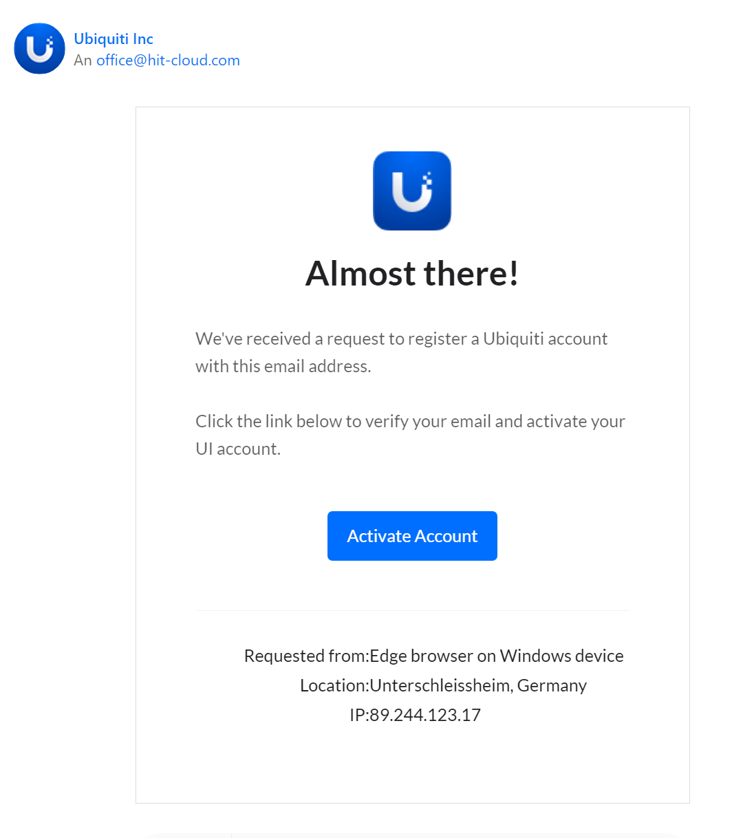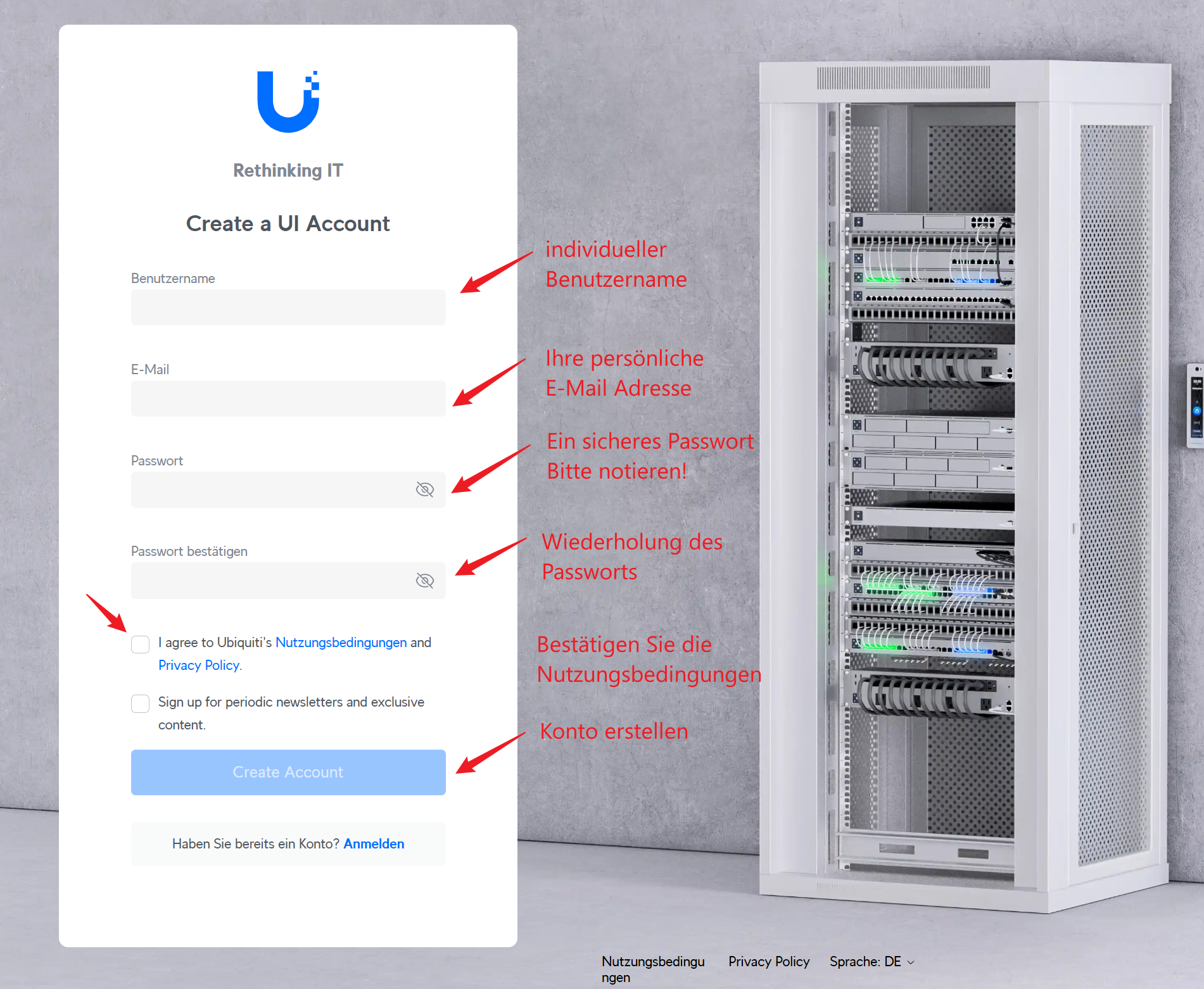 Besuchen Sie folgende Webseite: https://account.ui.com/register und erstellen Sie ein Konto mit Ihrer persönlichen E-Mail Adresse.